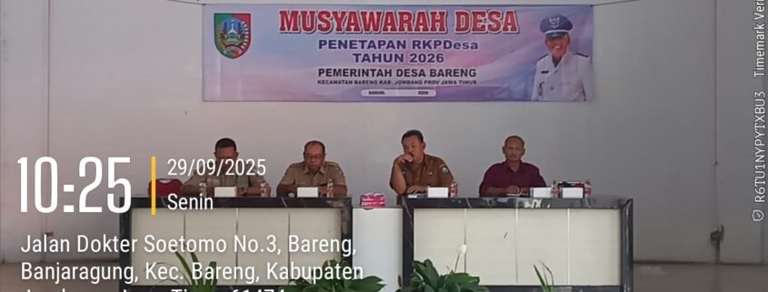 Mengawali minggu ke lima di bulan September tepatnya di Hari Senin Tanggal 29 September 2025 bertempat di balai desa Bareng. Pemerintah telah menetapkan Rencana Kerja Pemerintah Desa tahun anggaran 2026. Sebuah proses yang harus dilaksanakan oleh desa adalah penyusunan rencana kerja yang telah dibahas bersama sama oleh steakholder guna menentukan arah kebijakan di tahun 2026. Musyawarah Desa penetapan RKPDesa dihadiri oleh Camat Bareng yang dalam hal ini diwakili oleh Kasi PMD, Kepala Desa, BPD dan unsur undangan lainnya telah sepakat bulat menerima dan oleh pimpinan sidang Bapak M Thohir selaku Ketua BPD dalam Musyawarah Desa telah ditetapkan sebagai produk hukum yang akan dituangkan dalam peraturan Desa Bareng.